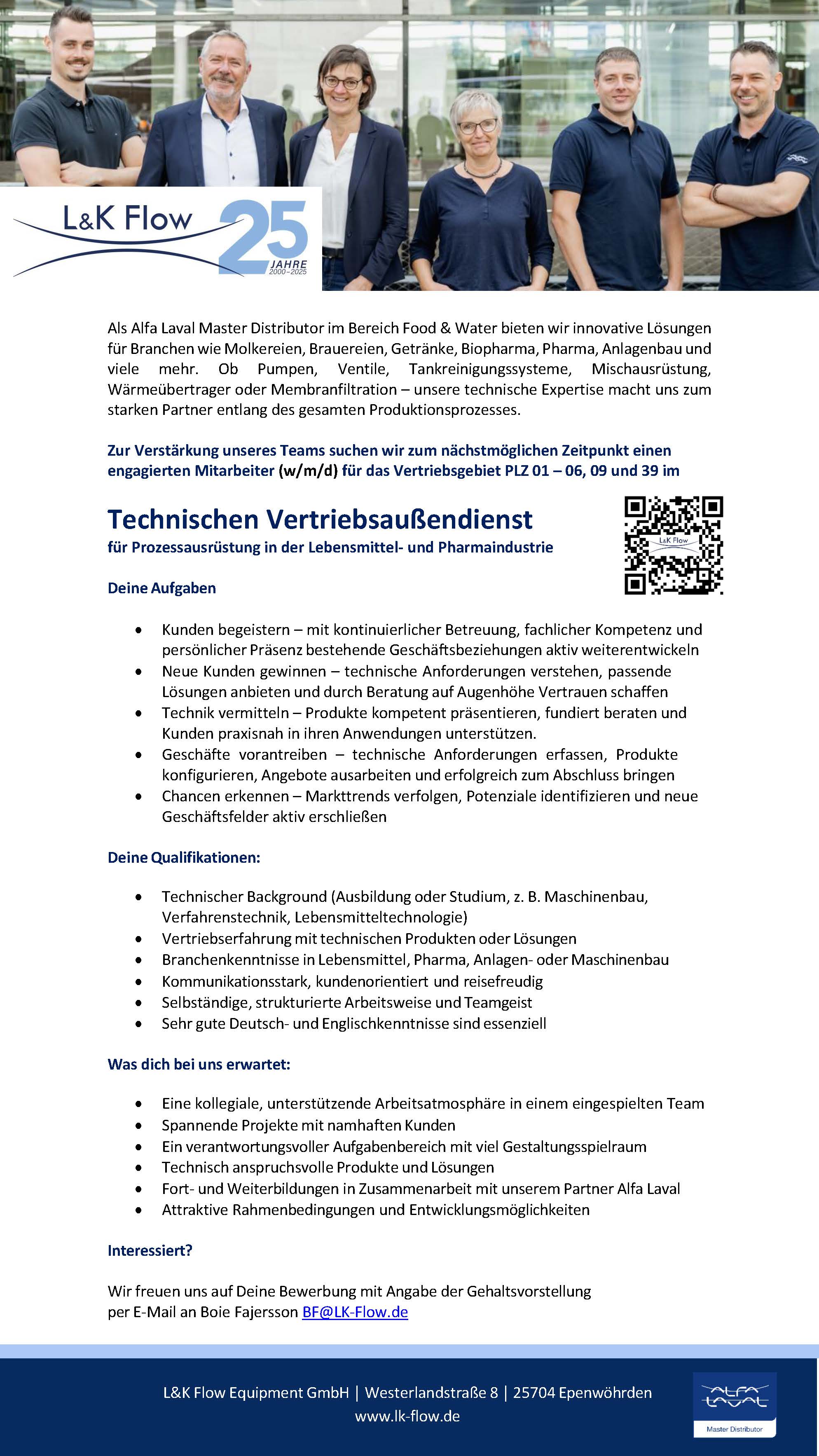 Als zertifizierter Alfa Laval Master Distributor im Bereich Food & Water bieten wir maßgeschneiderte und innovative Lösungen für anspruchsvolle Branchen wie Molkereien, Brauereien, Getränke, Biopharma & Pharma und viele mehr. Unser Portfolio umfasst hochwertige Komponenten wie Pumpen, Ventile, Tankreinigungssysteme, Mischausrüstung, Wärmeübertrager oder Membranfiltration – alles für einen effizienten und sicheren Produktionsprozess. Wir verstehen uns als verlässlicher Partner für Endkunden, Tank- und Anlagenbauer und Instandhalter – mit tiefem Produktwissen, hohem Serviceanspruch und einem klaren Verständnis für die Anforderungen sensibler Produktionsumgebungen.